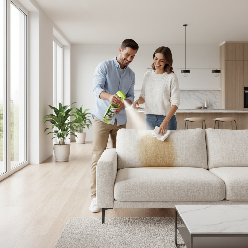 It can be used on countertops, kitchen appliances, tiles, floors, bathroom fittings, plastic surfaces, garden furniture, and light upholstery fabric (after a patch test).